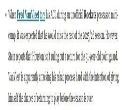 本赛季开赛前,范弗利特意外遭遇右膝前交叉韧带撕裂,去年夏天以两年5000万美元续约火箭。