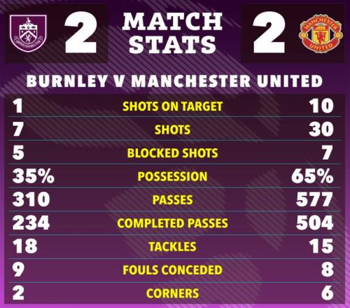上半场补时阶段,B费直塞,多古面对门将挑射,也被伯恩利后卫马克西姆·埃斯特维补门挡出,曼联只好带着0-1的比分返回更衣室。
