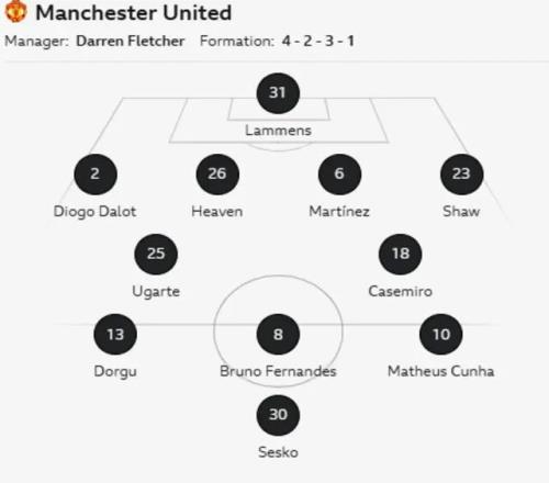 弗莱彻徇众要求安排了4231的阵型,队长布鲁诺·费尔南德斯伤愈复出首发并回到了10号位,与谢什科、帕特里克·多古和库尼亚组成进攻线,卡塞米罗和乌加特担任后腰,防线仍然是迪奥古·达洛、埃登·海文、利桑德罗·马丁内斯和卢克·肖,门将自然是塞纳·拉门斯。