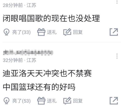 另一部分球迷则对CBA表达了不满,分别拿了迪亚洛和前段时间在奏唱国歌仪式中没有行注目礼的徐远征来说事:迪亚洛天天冲突也不禁赛,中国篮球还有的好吗?闭眼唱国歌的现在也没有处理!